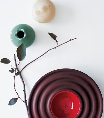 紅色的八仙瓶與福壽瓶於極簡的家居環境中,漆光的質感與色澤折射成為房間中的亮點。一只小小的千紙鶴將冷靜的氛圍變得富有生氣。