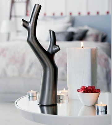 盛滿紅色糖果的骨瓷碗,搭配白色蠟燭與現代感十足的樹形花瓶,冷色中的一抹紅色格外打眼。燭光下,方形蠟燭肅靜的單純讓空間充滿古典的純淨意味。