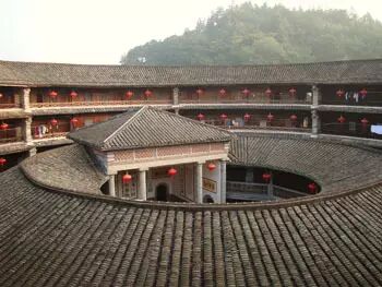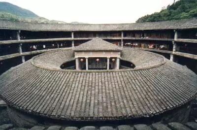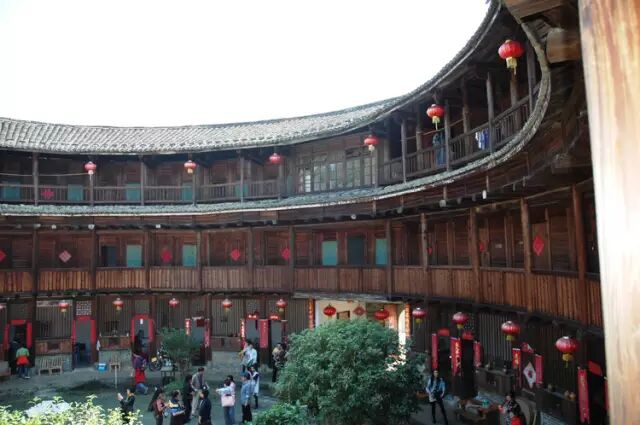 客家圓樓幾百個房間一律大小相同,這種布局,對於傳承中原儒家文化的客家人來說,似乎是不可想象的事情。在它的功能安排中,一樓二樓主要為廚房和谷倉,三層以上才住人,全樓唯一至高無上的是位於圓樓中心的祖堂。這是一種奇特的聚落方式,這種方式似乎只有在人類的童年時代才能找到。在很多原始部落的遺址中,就可以發現這種以圓形為中心的聚落方式。因為那時候,生存和防御是第一需要,而圓形似乎更有利於集體的團結。