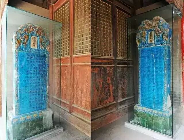 這兩通琉璃碑燒造於萬歷年間,碑高二百五十厘米,寬六十八厘米。碑額螭首為黃色二龍戲珠,栩栩如生。碑身孔雀藍色,碑文用黑釉書寫。這是世界上絕無僅有的琉璃藝術珍品,絕對的稀世之寶。
