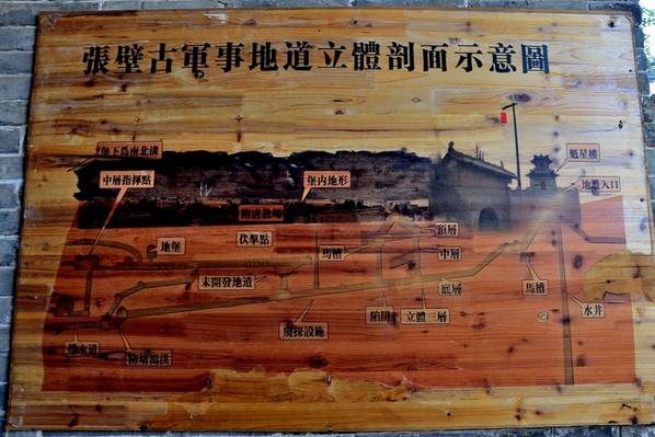 地道最上面一層距離地面僅1米左右,中間一層地道距離地面十幾米,而最下面一層距離地面足有二十多米深。地道內有指揮窯、將軍窯、儲藏窯、伏擊窯、馬槽、陷阱、天眼、水井、排水道等,融攻、防、藏、遁於一體,縱橫曲折,四通八達,其設計奇巧,規模之宏大,有“地下長城”之譽,且與地上明堡巧妙連為一體,令人歎為觀止!