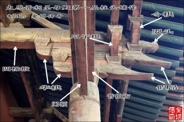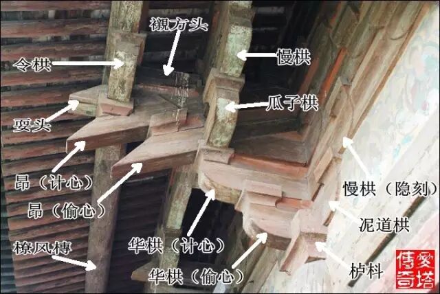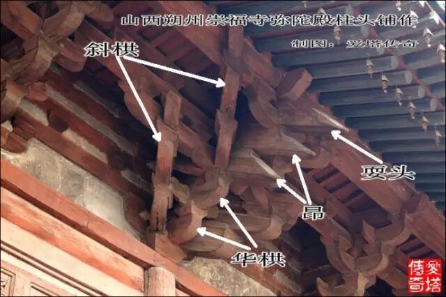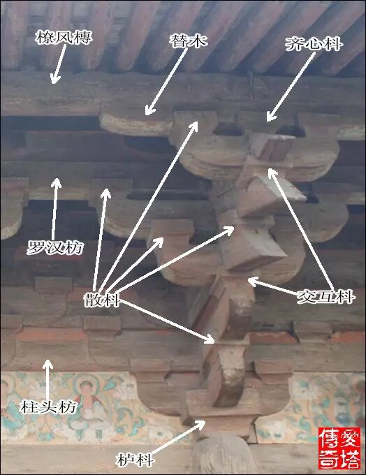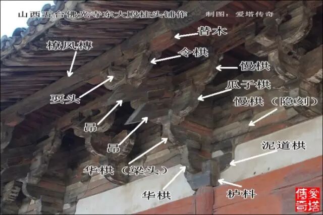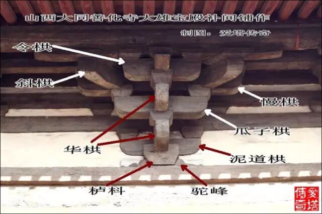 這張圖和上張是一朵鋪作,不同視角,標出各部件名稱。(山西平遙鎮國寺萬佛殿)