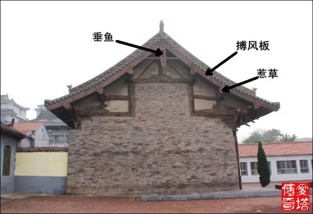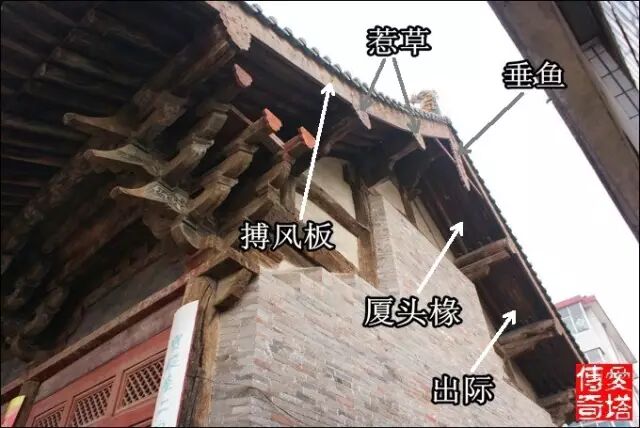 懸山頂和九脊頂兩山伸出的部分稱為“出際”,安裝於出際處的椽子稱為“廈頭椽”因為九脊頂又稱“廈兩頭造”,而懸山頂沒有兩山出檐,又稱“不廈兩頭造”。搏風板安裝於山面出際處以擋風雨,垂魚惹草即保護槫頭又能起裝飾作用