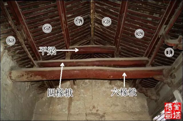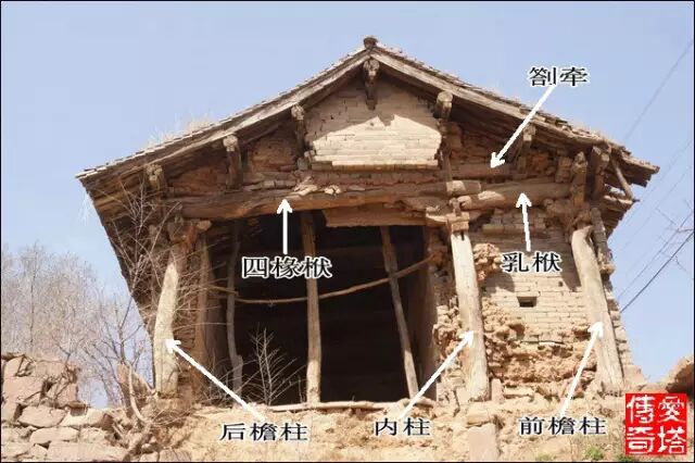山西長治市級文物保護單位壺關縣清流老君廟元代正殿的東山牆在2013年雨季坍塌了,梁架外露,六椽屋四椽栿對乳栿用三柱是晉東南地區早期大木作最常見的梁架結構形式,這張圖標出了主要構件的名稱。