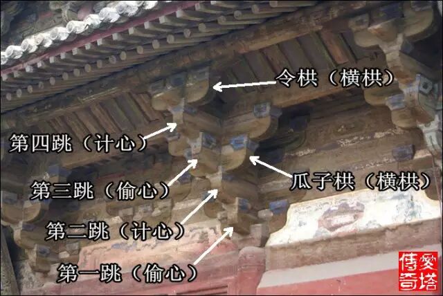 華栱或昂向前挑出一段稱為“跳”,這張照片中下面的華栱和昂各向前挑出一段,各出一跳,這朵枓栱一共出兩跳。耍頭不向前挑出為不出跳