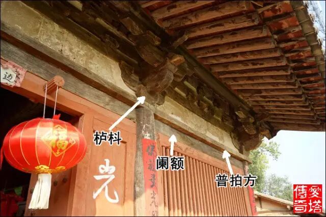 闌額是柱頭間的聯系構件,安裝於柱頭,上皮與柱齊平,有些建築柱子最下端也有一道這樣的聯系構件,稱為“地栿”。普拍方安裝於柱頭闌額之上,壓於栌枓之下。普拍方與闌額的斷面呈“T”字形。早期建築一般不用普拍方,現存十幾座唐和五代建築中只有平順大雲院彌陀殿使用了普拍方,宋以後開始應用廣泛。(山西沁縣大雲院正殿)