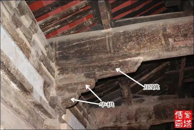 鋪作裡轉一般比較簡單,配圖這個使用了華栱和壓跳,也有些直接只用華栱。(山西屯留寶峰寺五方佛殿)