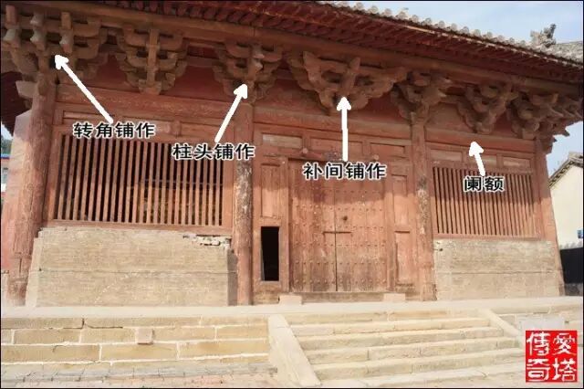 鋪作是由斗拱組成的構造單元,分為三種,立於柱頭的稱柱頭鋪作;立於兩柱之間闌額或普拍方上的是補間鋪作,立於轉角處角柱上的叫轉角鋪作。附圖是座歇山頂建築,前檐可見兩朵柱頭鋪作、三朵補間鋪作、兩朵轉角鋪作。如果是懸山頂,則沒有轉角鋪作。(山西沁縣普照寺正殿)