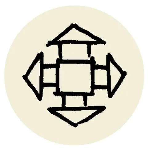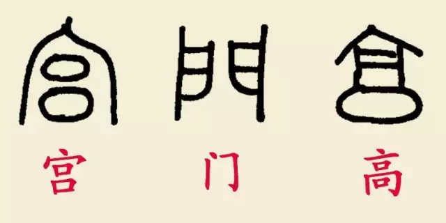 這是一個「宮」字,頗似一張建築平面圖。它的中央有一個方形院落,四周各自分布一座房屋,整體布局似乎已經有了相互對稱的形制。在中國古代,一直以類似的繪圖方式表現建築的平面。
