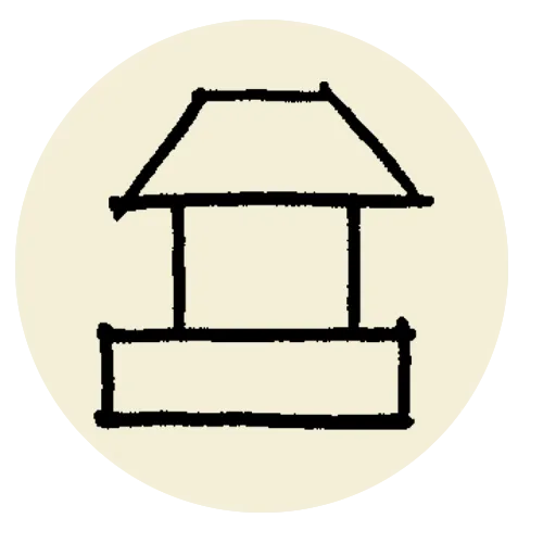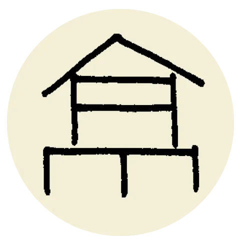 上圖是甲骨文中的「室」字,可以看出當時已有建造台基,且有一個四面坡的屋頂,這個字猶如一幅簡要的立面圖,一目了然的呈現出房屋的外觀。