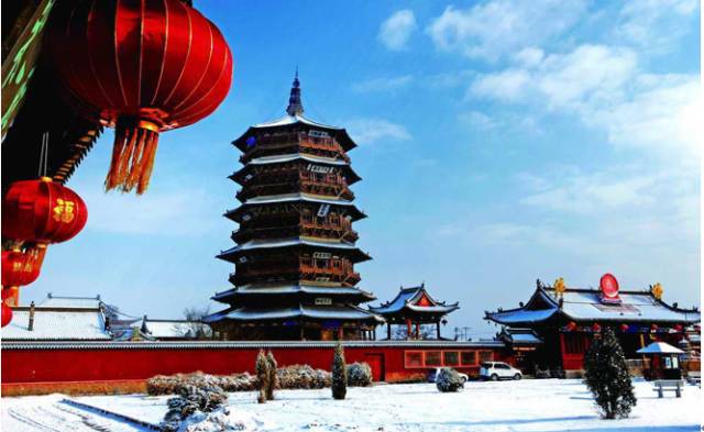 亦稱應縣木塔,至今已有近千年的歷史,是國內外現存最古老、最高大的純木結構樓閣式建築,是我國古建築中的瑰寶,世界木結構建築的典范。木塔通高67.31 米,底層直徑30.27米,總重量約7400噸。整個建築由塔基、塔身、塔剎三部分組成。塔高九層,塔剎直插雲霄。塔每層檐下裝有風鈴,微風吹動,叮咚作響,十分悅耳。釋迦塔內彩塑皆面相圓潤,軀干修長,服飾華麗,是金代彩塑中的精品。木塔上歷代名人掛匾題聯,寓意深刻,筆力遒勁。應縣木塔的設計,大膽繼承了漢、唐以來富有民族特點的重樓形式,結構上采用雙層環形套筒空間框架,形成一層比一層小的優美輪廓。全塔在結構上沒用一個鐵釘,全靠構件互相卯榫咬合。全塔共使用了54種不同形式的斗栱,種類之多,國內罕見,被世人稱為“斗栱博物館”。