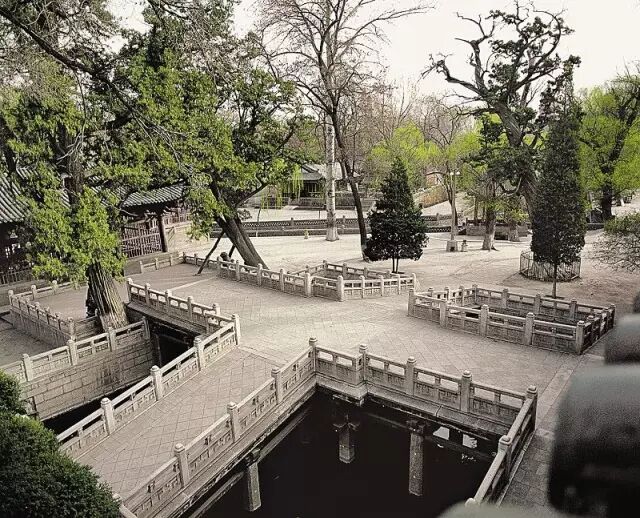 魚沼飛梁為一方正方形水池,是我國橋梁建築史上的傑作。建於北宋,東西長19.6米,寬5米,高出地面1.3米,南北橋面長19.5米,寬3.8米。其結構為池中立三十四根小八角形石柱,柱頭卷殺,柱頂架斗栱和梁木承托著十字形橋面,東西平坦連接聖母殿與獻殿,南北兩翼下斜至沿岸,四周有勾欄圍護憑依,整個造型猶如展翅欲飛的大鳥,故稱飛梁,是我國現存古橋梁中的孤例。