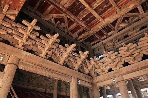 佛光寺東大殿造形規整完善,制作精細,技法純屬,堪稱我國唐代建築的代表作。大殿構架由屋深柱網、鋪作層和屋頂梁架三部分疊加而成,七鋪作斗栱縱橫恣肆,威壓四方,是現存中國古建築中斗栱挑出層數最多、距離最遠的一個實例,在脊檩下僅用叉手的做法,也是現存古建築中的孤例。殿內的唐代塑像和唐代壁畫荟萃一堂,極為珍貴。集塑像、壁畫、墨跡、建築於一體的東大殿,被我國著名建築學家梁思成先生稱為“第一國寶”。(山西十大最美古代建築[J]. 文物世界, 2012(10).)