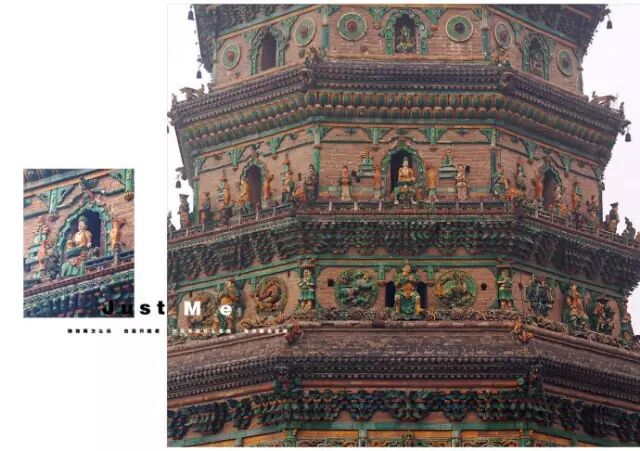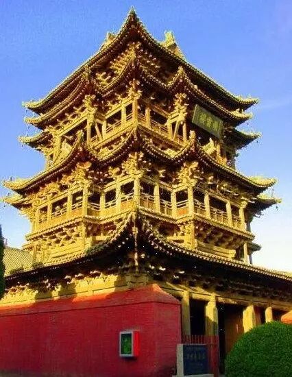 “一塔玲珑駕碧空,滿山翠柏起秋風。”每逢紅日高照,位於洪洞縣城東北霍山南麓的此塔金碧輝煌,仿佛美麗的彩虹,故名“飛虹塔”,也是佛界公認最美麗的“浮圖”。始建於漢代,現存為明嘉靖六年(公元1527年)重修,是我國現存最完整的大型琉璃古塔。平面八角形,13級,高47.31米,通體用琉璃瓦裝飾而成,層層皆有琉璃出檐。下三層尤其精致,有飛檐凌空下的斗拱,制作精巧的蓮花椅柱,上刻各種圖案,佛像凝重肅穆,菩薩慈祥可人,和尚憨態可掬,力士威風抖擻,童子天真活潑,造型生動逼真,色澤艷麗奪目。(山西十大最美古代建築[J]. 文物世界, 2012(10).)