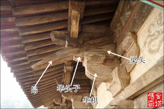 這四座建築中南禅寺大殿、廣仁王廟正殿、佛光寺東大殿都是梁頭壓在裡外轉一跳華栱之上伸出為第二跳華栱,另外莫高窟196窟檐和青蓮寺藏經閣是梁頭壓在裡外轉一跳華栱之上伸出為華頭子,無論是出第二跳華栱還是華頭子,都是梁頭在裡外轉一跳華栱之上成為枓栱的一部分,這種結構原理在以後的五代、北宋建築中也沒再有應用,同樣符合“上一代有,下一代無”的斷代原則。