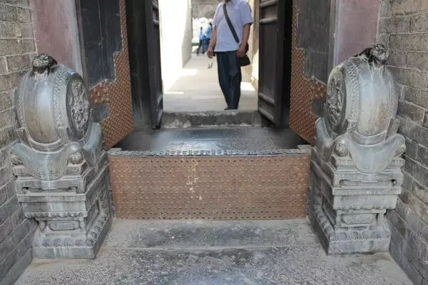 門枕石一般都是長條形的,一頭在門外,一頭在門內,中間一道凹槽供安置門的下檻,門內部分上面有一凹穴,標准的學名叫海窩,供門軸轉動之用。一般情況下,門內的部分稍短,門外的部分相對較長。