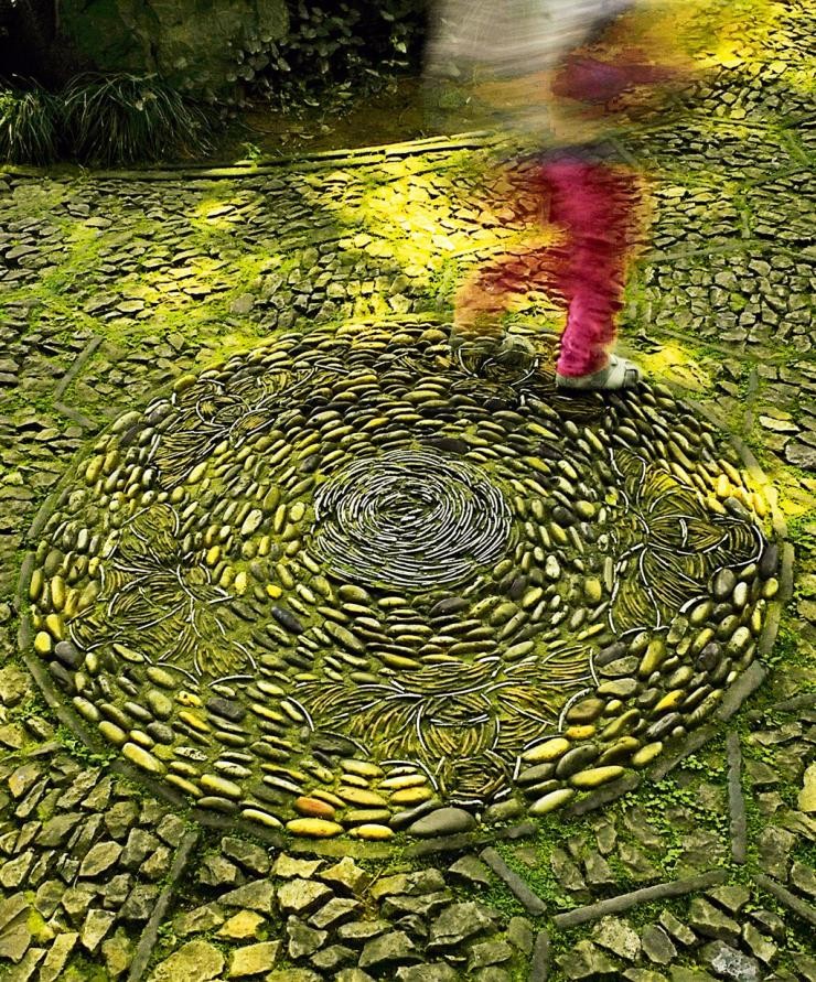 四只蝴蝶,撲向中間的花朵,這一幕蝶戀花出現在不起眼的地面上,在寄暢園中有多處,此手法曰“鋪地”。值得一提的是,拼出這幅圖案的鵝卵石、磚塊,是當年造園的建築廢料,在此重新煥發出光彩。