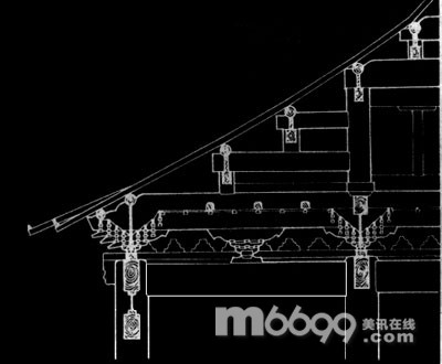 宋《營造法式》中所載各種殿堂構架的斗拱與梁架結合,已不如唐代緊密,但仍類似。第三階段為明代至清代。自明代開始,柱頭間使用大、小額枋和隨梁枋,斗拱的尺度不斷縮小,間距加密。清式建築的梁不再像宋式那樣穿插在斗拱中,而是壓在斗拱最上一跳之上,直接承挑檐桁。因此,斗拱發展到明清以後便不再起維持構架整體性和增加出檐的作用。它的用料和尺度比宋式大為縮小。