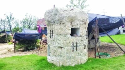就在這處金口遺址園的門口,記者發現一處很特別的景觀,用廢棄樁頭切成的巨型“藕片”。這些“藕片”每片直徑都將近兩米,豎起來跟一個成年人差不多高。裝這些“藕片”的盤子也是一截混凝土樁頭,不過切得更厚一些,如果刷成黑色就變成巨型“蜂窩煤”了。