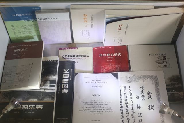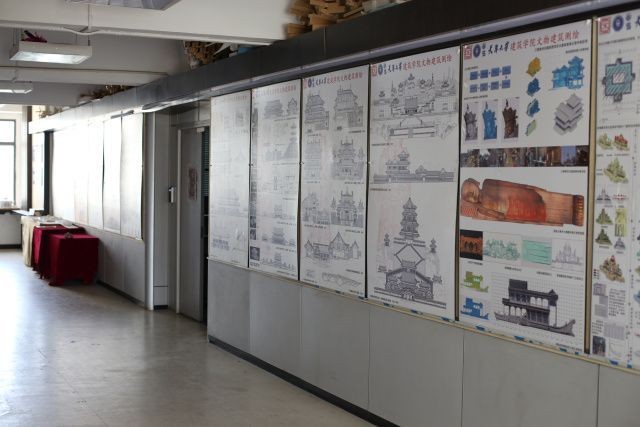 走進天津大學建築學院的三樓展廳,更像來到某個古建築展覽館的一角。一側牆面上滿滿都是圖紙,從手繪稿到遙感圖,一眼望去全是古代建築的輪廓。另一側的玻璃展台裡,陳放著經緯儀、投影儀等。在兩邊展板的上檐,擺滿了用木頭或泡沫做成的斗栱模型。
