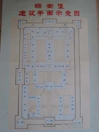 瑞安堡位於甘肅省民勤縣城南郊3.5公裡處,建於民國二十七年(1938年)。系地方保安團長王慶雲(字瑞庭)的莊堡,該堡長90米,寬56.5米,牆高10米占地面積5089平方米,建築面積2394平方米,堡內建築布局字排“一品當朝”,形呈“鳳凰單展翅”。分七庭八院,門樓庭閣八座,高脊瓦房一百余間,堡牆上有射擊孔、地道、暗堡、天井及四通八大的人行道。