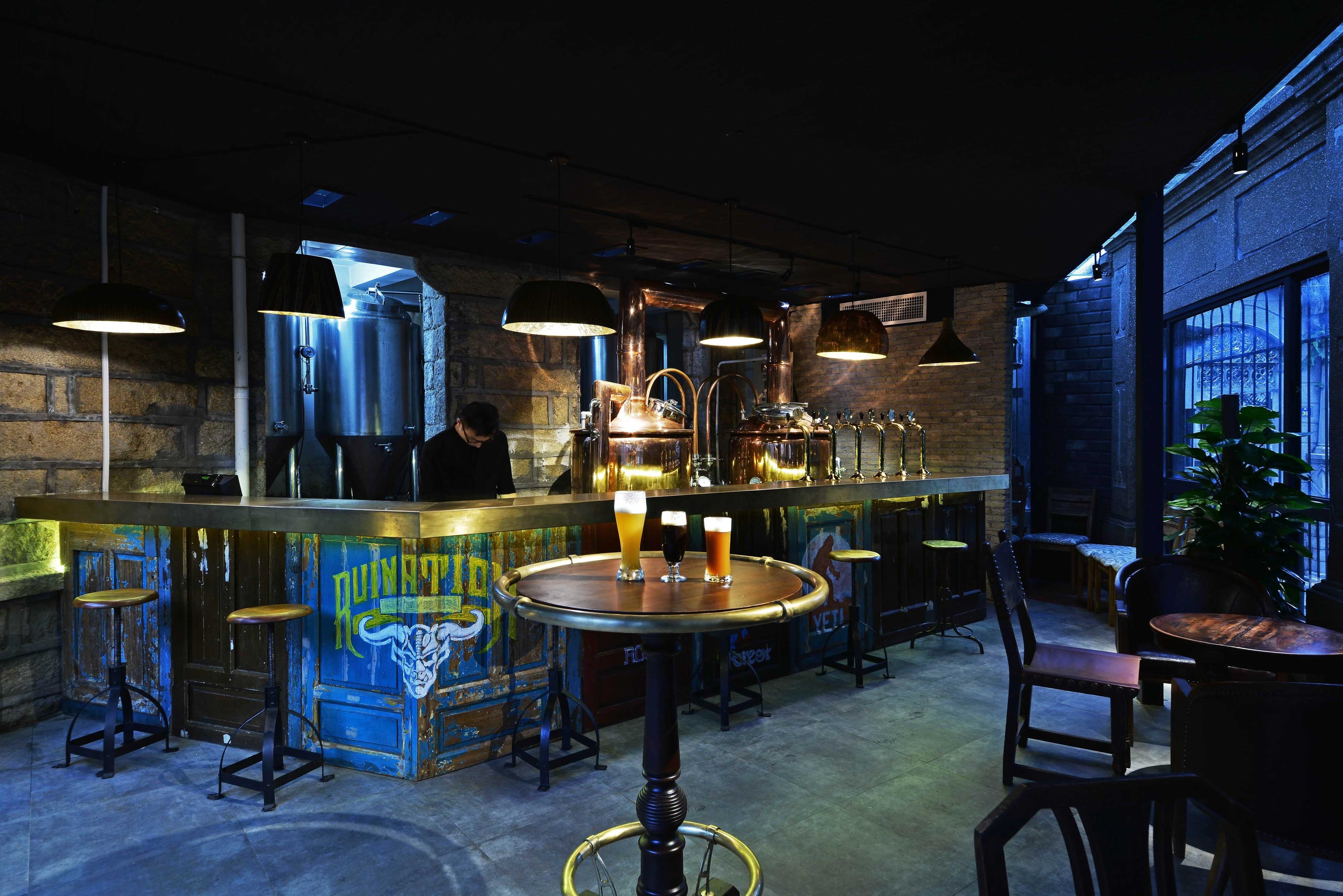 老牆磚的保留和回收木料的再利用,讓時間的痕跡在新的空間中得以延續。新鋪的水洗石地面和緬甸柚木細條地板,同舊材料保持了一種弱對比的狀態。黃銅作為吧台的主材同樣也被使用於精釀啤酒花園,配合回收的舊門板,與銅質的啤酒發酵罐相得益彰。
