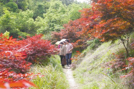 古道上的紅楓令探訪者駐足細賞。