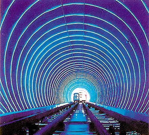 上海外灘觀光隧道通過聲、光、電、激光等高科技手段,在圓隧道內制作出五光十色的動態景觀。與廣州APM大不相同的是,游客會經過“時光隧道區”、“漩渦區”、“穿梭區”、“巖漿噴射區”等8個內涵各異的景區,各種奇異的視覺效果令人眼花缭亂,短短5分鐘,就像經歷了一場科幻之旅。單程票價40元,雙程票價50元。