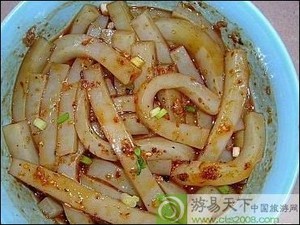 豆類或山芋的澱粉,加適量水稀釋成糊,煮熟後冷凝成塊,俗稱“涼粉’。連雲港的涼粉種類多,有豌豆粉、綠豆粉、山芋粉等,爽口清香味濃。涼粉的制作各人有各人的竅門,往往秘不示人。涼粉的吃法一般有熱吃、冷吃兩種。熱吃,是把涼粉放在燒熱的平底油鍋上,略煎一下,等底部有一層焦黃的皮後取出切塊食用。冷吃,即將涼鉛直接食用。吃前,將涼粉切成塊狀,或刨成面條狀,還有事先用漏勺漏成“娃娃魚”狀,放入清水中,待吃時取出,根據顧客的口味放佐料,如放醬油、醋、麻油、蒜泥等;喜歡吃辣的人,還可以加入一些辣椒醬,風味獨特。
