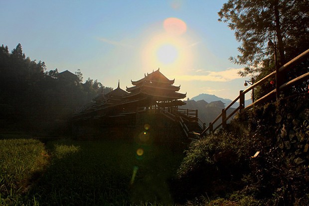 程陽風雨橋橫跨林溪河上,五個石砌大墩上建有五座塔式橋亭和19間橋廊,亭廊相連,渾然一體,蔚為壯觀。橋兩側都是出售侗族手工藝品的小攤,有侗繡、織錦、首飾、竹木器具等,侗族老婆婆手中做著女紅,邊吆喝著一口侗腔普通話,那聲音如大哥般清脆爽朗,伴隨太陽東升西落,迎送橋上客來客往。倚欄而坐放眼望去,河水蜿蜒曲折,沿河一架架大型水車伴著這潺潺流水,吱吱嘎嘎的緩慢轉動著。河岸的草芒和晚稻正在一起抽穗揚花,深呼一口氣,山村的空氣在特有的清新中帶著微微的澀。不遠處的侗家吊腳樓依山傍水,鱗次栉比,連成一片,層層而上,風雨橋是村裡人歇腳小憩的地方,也是侗族情侶們幽會密語的好去處,待月上枝頭,溪水若碎銀閃亮,就有了竊竊的私語聲,就有了甜甜的或憨憨的笑。