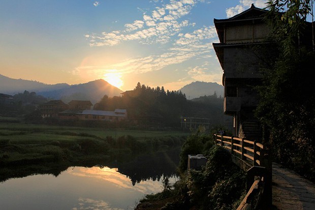 程陽不僅以風雨橋聞名,程陽八寨的風景也是濃縮了侗族文化之精華。八寨由大寨、東寨、平寨、巖寨、馬鞍、平坦、平鋪、吉昌八個村寨組成,其中大寨、東寨、平寨、巖寨、馬鞍五個寨子相隔不遠,踏著寨中的青石板,迂回於高高低低、錯落有致的吊腳樓群中,行至一處平坦之地,便能看到一棟巍然挺立的鼓樓,那是整個寨子的中心。秋末冬初這是稻谷豐收的時節,勤勞的洞主人將打下來的谷粒平鋪在鼓樓前的蘆笙場上晾曬,好似一張金黃的地毯,鼓樓裡聚集了一群男女老少,圍爐而坐,閒話家常,一位老者吹起蘆笙,那曲聲余音繞梁,回蕩在這斗拱支柱間。若要走遍八寨子,去平坦、平鋪和吉昌,最好租上一輛自行車,沿途可欣賞自然淳樸的田園風光。