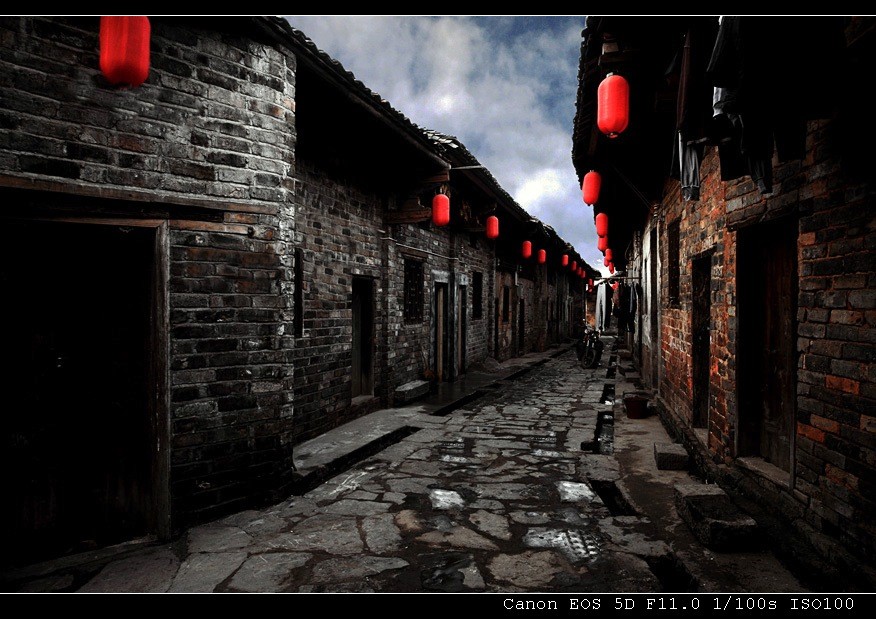 古村的夜晚,潑墨般漆黑的夜色裡,明明滅滅的燈籠,照著露水濡濕的古巷,照著因貪玩忘了歸家的孩子。青青的瓦礫上,古老的牆壁間,落滿了蛙聲一片,蟋蟀唧唧。
