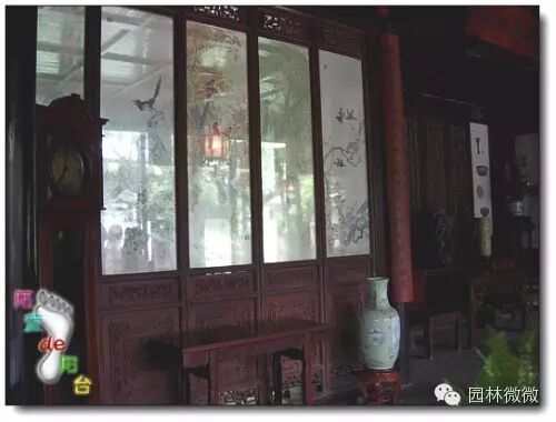 亦稱紗隔,與長窗頗相似,在蘇州古典園林中常以紗窗來分隔空間,它避免了砌牆造成的呆板,不僅增加了文化內涵,也顯示園主的富有。紗窗一般不用明瓦(即蚌殼經特殊加工成半透明狀約6~8厘米見方的薄片)作遮擋,而是釘鋪絹紗或者布置書畫。如留園“金玉滿堂”即布置書畫,人們在游園的同時也能夠欣賞到書畫藝術,又如在該園的“五峰仙館” 內的紗隔上繪、寫書畫,藏與露盡在其中。怡園“梅花廳事”紗窗中夾堂采用半透玻璃替代絹紗,網師園集虛齋紗隔巧妙地將樓梯隱藏在後頗有實用和藝術性。