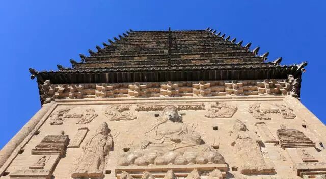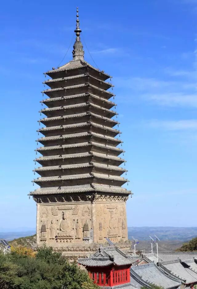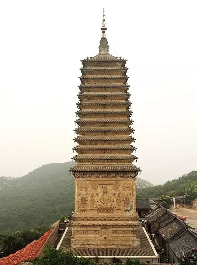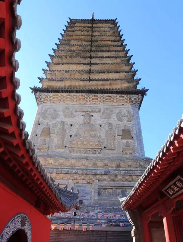 該塔為方形十三層密檐式實心磚塔,高37米。分為塔座、塔身、塔檐、塔頂四個部分。塔座為須彌式,四面各有一假門,兩側各雕有三個壺門,壺門內雕有佛和菩薩,兩側配有伎樂人,四角有力士。其上有仰覆蓮承托塔身。塔身四角為圓形倚柱,塔身四面正中各雕一尊坐佛,端坐於蓮花寶座之上,坐佛兩側各有一尊脅侍,頭戴冠,身披絡,神態恭敬。脅侍兩側各有一座小靈塔,似是大塔的縮影。塔身上為十三塔檐,由下至上逐層收斂。每層塔檐之間均鑲嵌銅鏡,四角掛風鈴。塔頂仰蓮覆缽,串四顆寶珠為塔剎。