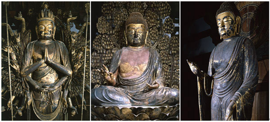 △從左到右依次為:奈良時代(8世紀)的千手觀音、盧捨那佛,和平安時代(9世紀)的藥師如來