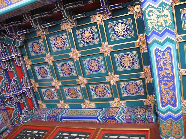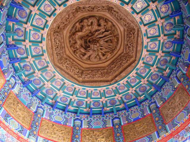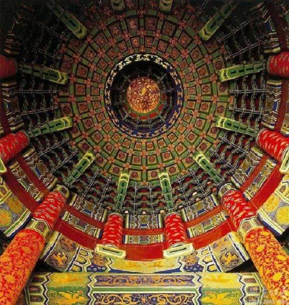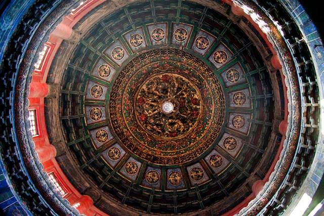 中國古人對自然和自然現象都懷著敬畏之心加以崇拜,所以古代先哲提倡“天人合一”,講究效法自然,推崇的“天圓地方”原則,是對這種宇宙觀的一種特殊注解。同樣,為了表現出對天的敬畏和崇拜,古人也給室內時的“天” 給予了特別重視,中國古代建築中出現了“穹然高起,如傘如蓋”的建築內部裝飾藻井。藻井的造型上圓下方,正符合中國古代“天圓地方”的宇宙觀。